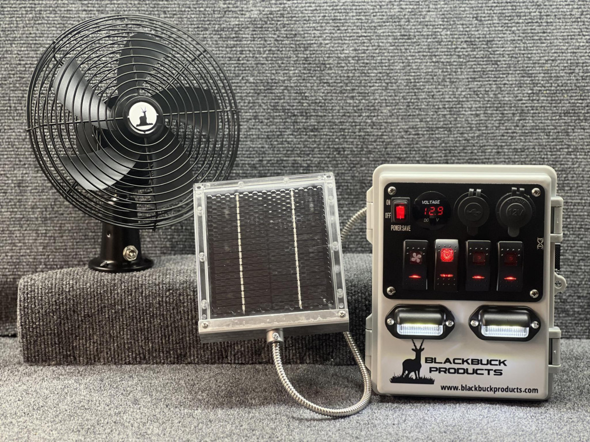 The Deer Stand Power Bank fan bundle is for hunters looking to easily add 12v power to any deer stand or duck blind. Just mount your charger wherever you want it, install a rechargeable 12v battery (the same kind as a 12v deer feeder uses), plug in the included solar panel to keep your system charged and you're ready to roll! Bundle includes a 8.75" plug-n-play fan.Charger Features:* Marine grade 4-bank rocker switch panel - 3 come prewired and 1 is open for future expansion* Multiple output sources including: USB and USB-C charging ports, cigarette lighter adapter port, and 2x DC power jacks* Smart technology power saver switch ensures no accidental discharge of power when not in use* Digital voltage meter to monitor battery levels at all times* Powerful solar panel included to provide a constant charge on your 12v rechargeable battery and ensures years of maintenance-free use* Self-contained in a durable weather-resistant ABS case - Additional Info